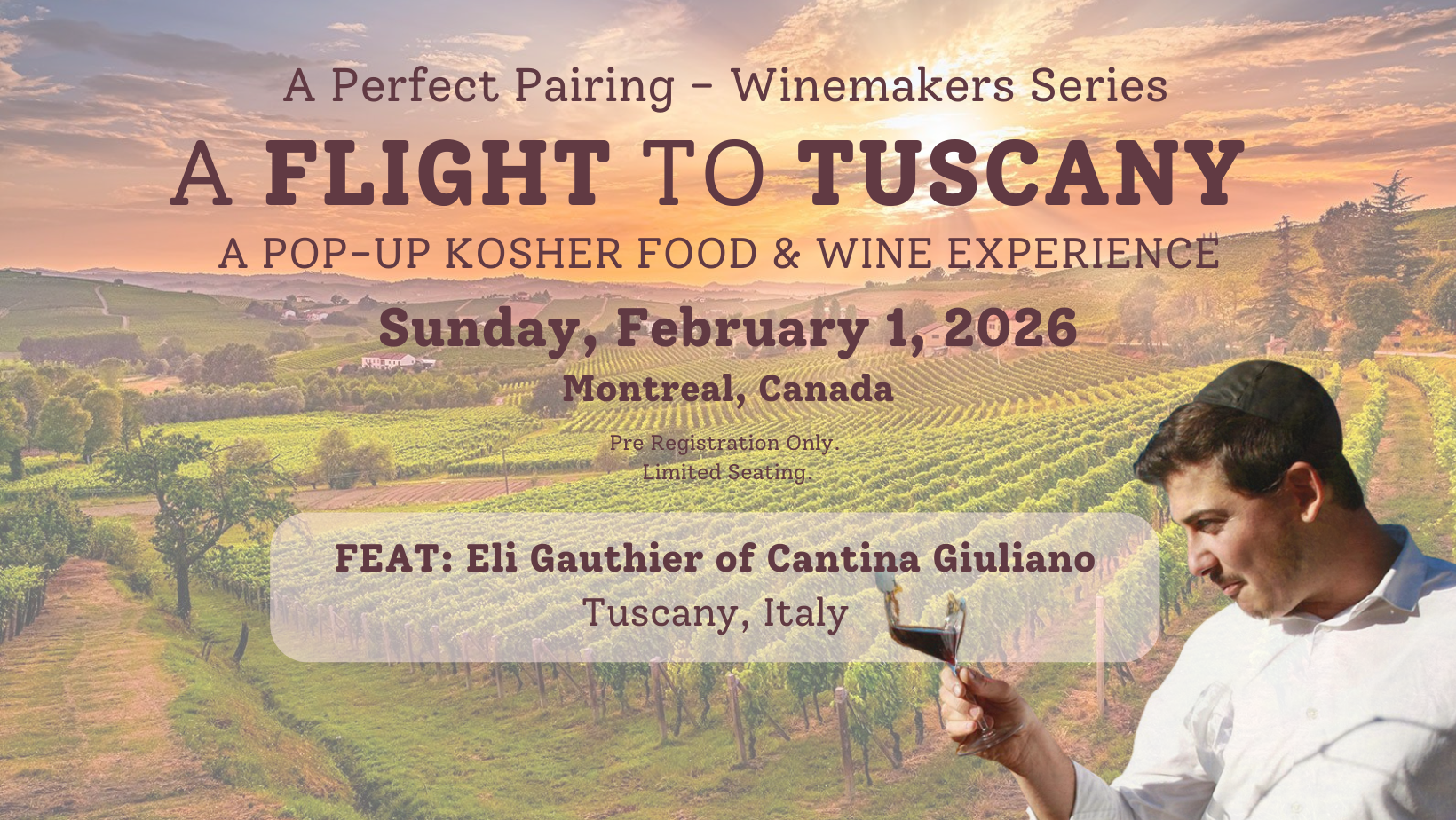Join us for The Perfect Pairing - Winemaker Series, A Flight to Tuscany | A POP-UP KOSHER FOOD & WINE EXPERIENCE a celebration of fine wine, exquisite cuisine, and cherished company.